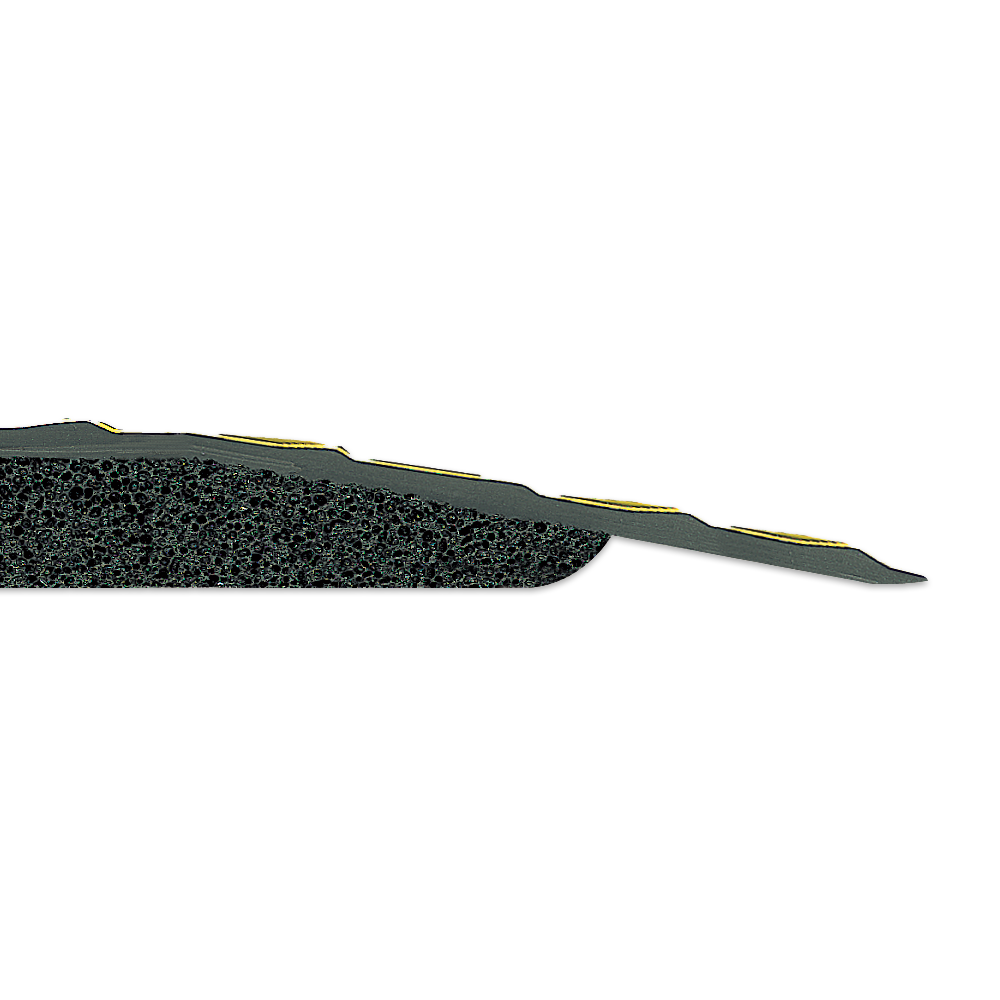 - der Belag besteht aus einem Hart-PVC Deckmaterial mit Rautenstruktur und einem Untermaterial aus geschäumtem PVC. Ober- und Untermaterial sind vulkanisiert und absolut fest miteinander verbunden.